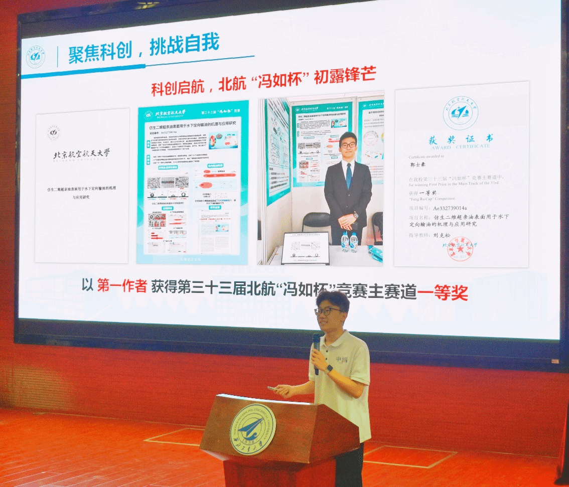 2024级硕士研究生郭士豪。他以自身成长轨迹为引,着重分享了自己在科研和竞赛方面的经验。针对本科生科研入门这一关键命题,他提炼出“五维成长法则”——多共通、多学习、多思考、多实践、多总结。他还分享了自己在科创竞赛过程中的实际经验,如PPT制作要点、答辩技巧、展板制作方法等,最后嘱咐广大同学做科研要坚持,从简单操作开始,逐渐能够独立完成课题。