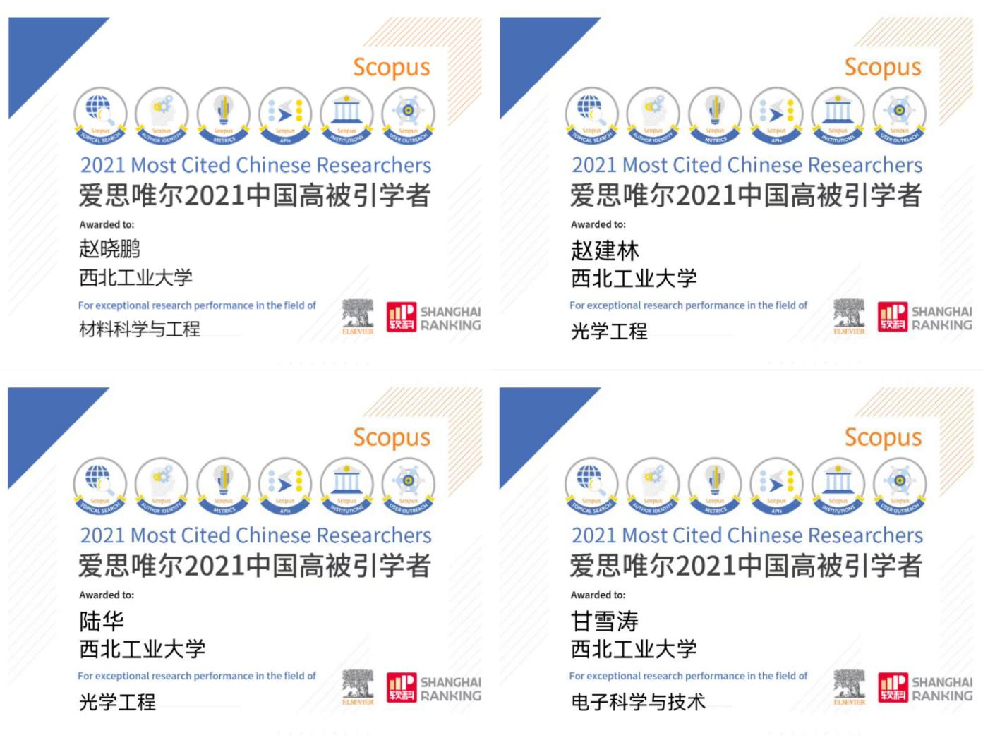 4人上榜。赵晓鹏教授入选材料科学与工程学科中国高被引学者,赵建林教授、陆华教授入选光学工程学科中国高被引学者,甘雪涛教授入选电子科学与技术学科中国高被引学者。