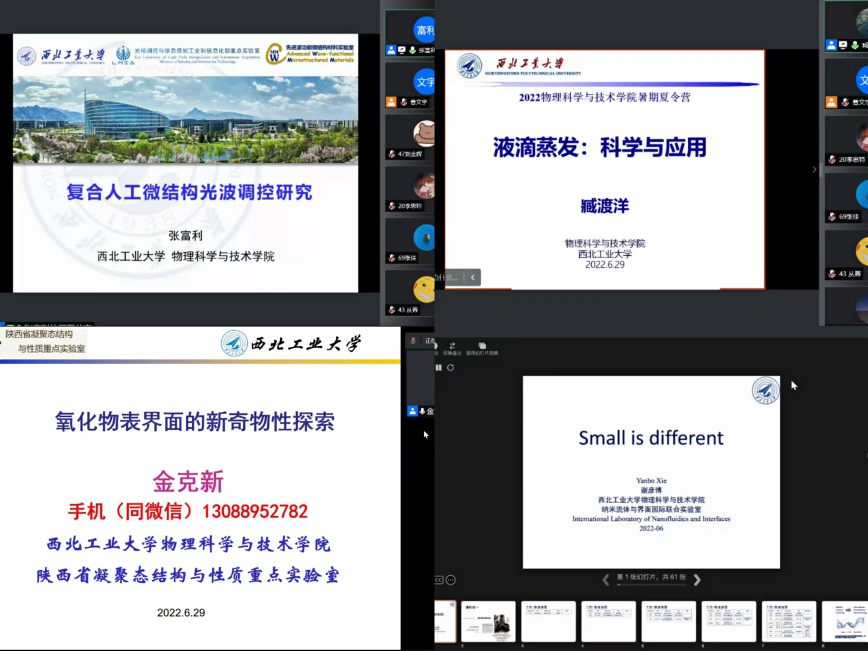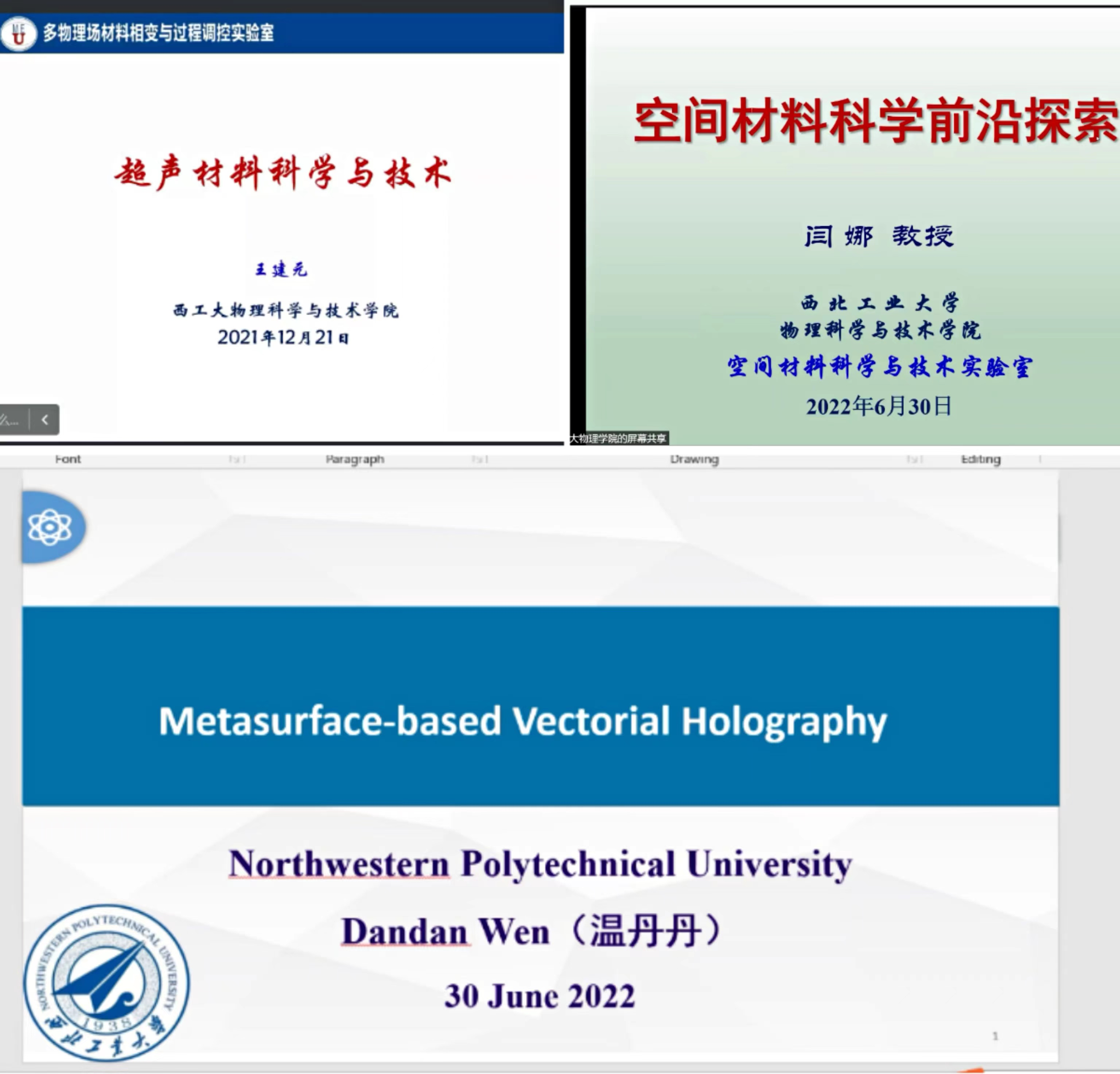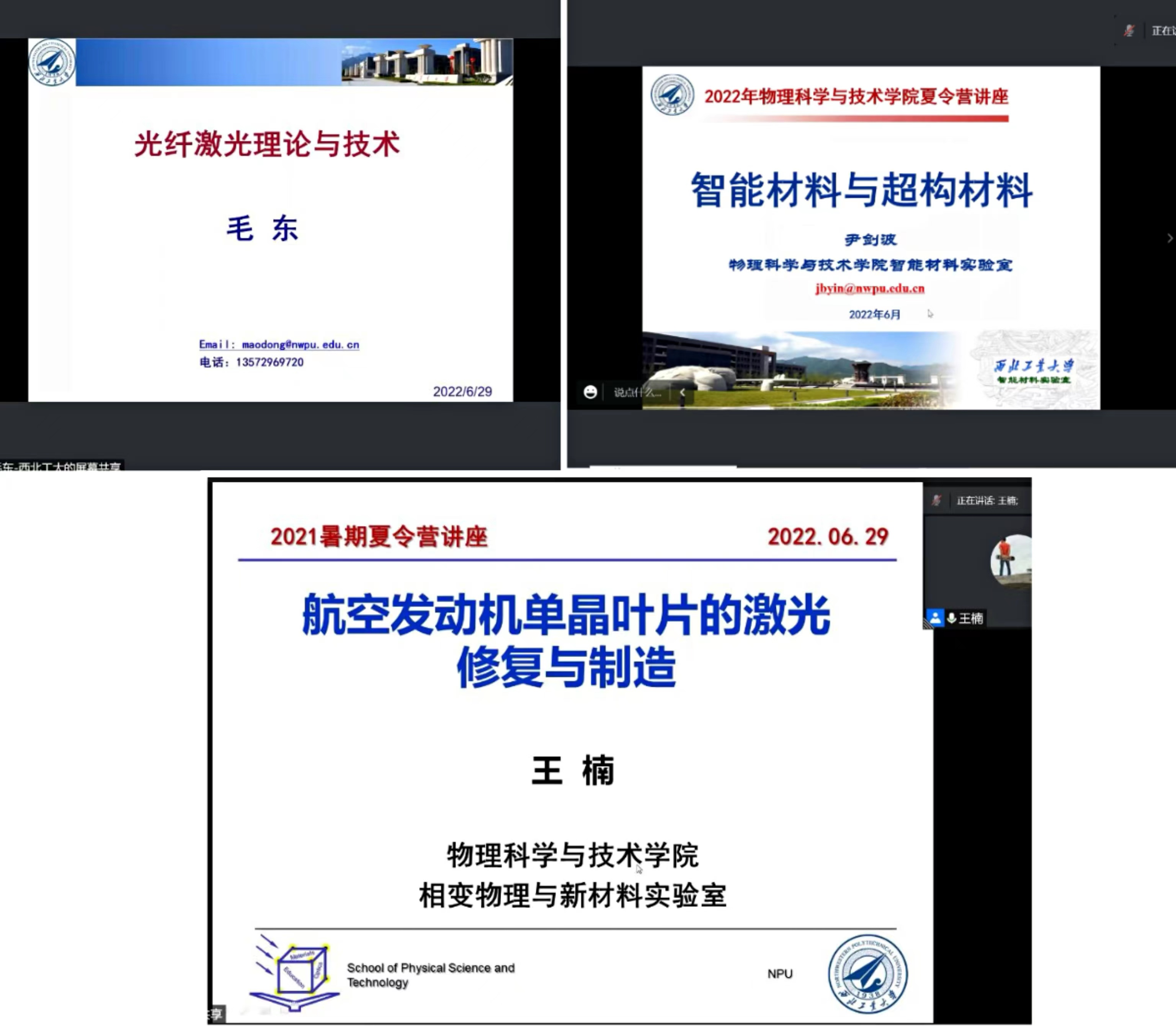 共安排十场学术讲座,尹剑波教授、王楠教授、毛东教授、张富利教授、臧渡洋教授、金克新教授、谢彦博教授、王建元教授、闫娜教授和温丹丹教授分别围绕“智能材料与超构材料”“航空发动机单晶叶片的激光修复与制造”“锁模光纤激光理论与技术”“复合人工微结构光波调控研究”“液滴蒸发:科学与应用”“氧化物表界面的新奇物性探索”“Small is different”“超声材料科学与技术”“空间材料科学的前沿探索”“超表面光电器件原理及应用”等主题进行了深入浅出的讲解,师生双方通过屏幕展开了精彩热烈的讨论,学生们收获颇丰。