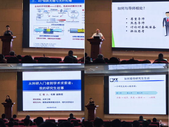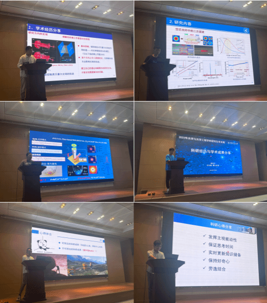光电信息科学与工程系主任及光学工程学科负责人杨德兴教授为同学们介绍了学科建设发展情况,勉励同学们“会当凌绝顶,一览众山小”,希望广大同学在学习和科研中,不畏艰难、勇于攀登,走向人生的顶峰。随后,学科优秀青年导师姜碧强教授、温丹丹教授、毛珊副教授和谢鑫副教授分别讲述了各自的科学研究和学术成长经历,分享了在科研过程中遇到的困难和克服困难的经验,勉励同学们在科研上敢于应对挑战,以认真严谨的态度和勤奋坚毅的品质攻坚克难,并叮嘱学生将身心健康放在第一位,注意科研和生活的平衡。