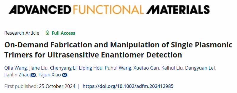 肖发俊教授、赵建林教授团队联合香港城市大学雷党愿教授、北京大学刘开辉教授在纳米科技领域顶级期刊《Advanced Functional Materials》发表了题为“On-Demand Fabrication and Manipulation of Single Plasmonic Trimers for Ultrasensitive Enantiomer Detection”的研究论文。JavLibrary