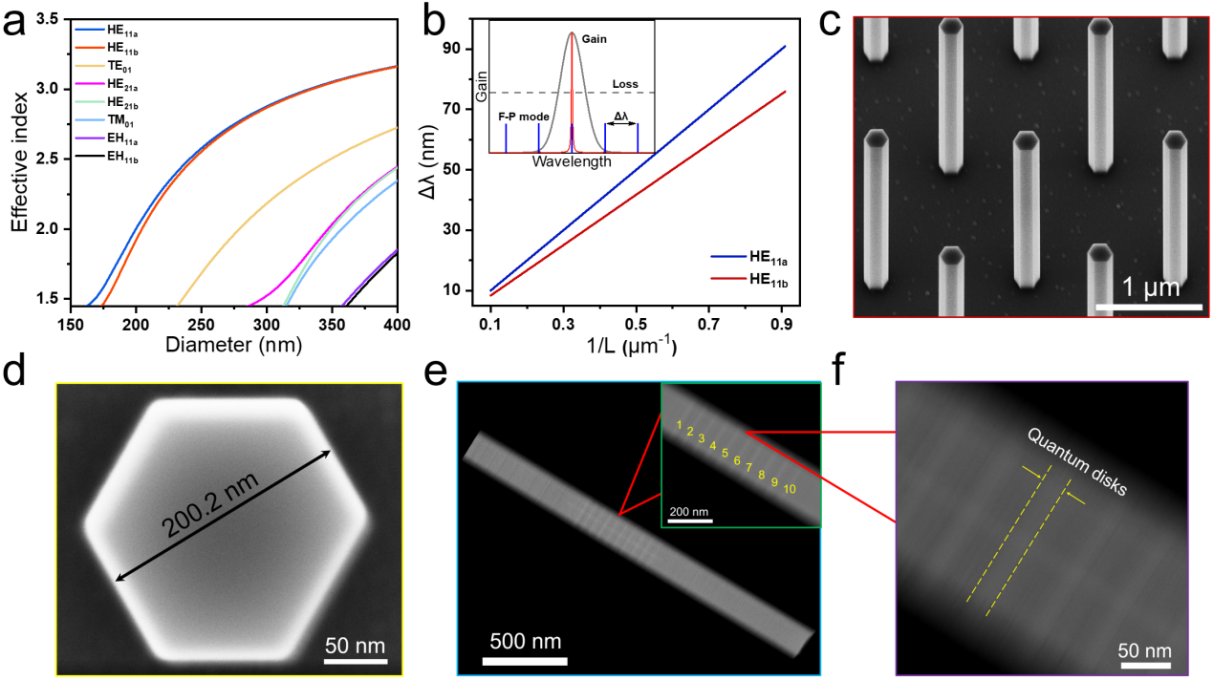 研究团队首先通过数值模型,辅助设计单模纳米线激光器几何结构参数(见图1)。通过减小纳米线直径,限制其所能支持的横模数目;通过减小纳米线长度,增大纵模间距,使其增益光谱范围内仅支持单个模式。另外,为了解决纳米线激光器由于物理尺寸减小而引起的阈值增大问题,研究团队利用有机金属化学气相沉积选区外延技术(SA-MOCVD),可控制备了镓化砷/铟镓砷量子盘纳米线,其规整的形貌、含多个量子盘,保证了低光学损耗和高材料增益。如图2所示,在5 K条件下,利用直径200 nm、长度2.2 μm的纳米线(为已报道纳米线激光器的最小尺寸)实现了低阈值(Pth= 1.6 μJ/cm2)、窄线宽(0.15 nm,Q= 6400),近红外波段(959 nm)的单模输出。