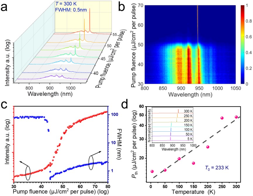 为提升激光器的工作温度,研究团队进一步生长了铝镓砷钝化层来降低纳米线表面非辐射复合。最终,成功实现了室温条件下(300 K),低阈值(Pth= 48 μJ/cm2)、高特征温度(223 K)、高功率(泵浦能量密度为59.5 μJ/cm2时,输出功率0.9μW)的单模激光输出(见图3)。相关研究对开发用于集成光电子芯片、智能光电传感、生物原位检测等领域的高性能纳米尺度相干光源具有重要意义。