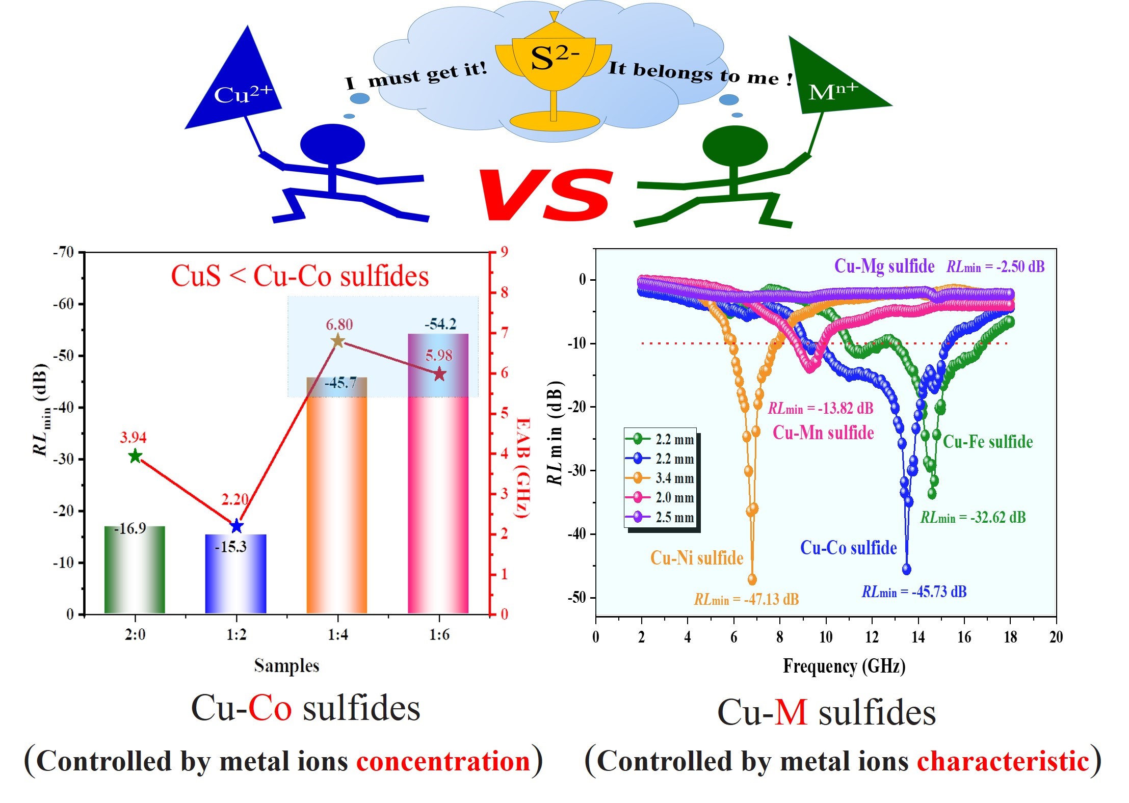 基于上述问题,受溶解度理论启发,我们创新性的提出了一种竞争反应策略,在低/中频微波范围内获得了高效、宽频的多组分吸波材料。以铜基二元金属(Cu-M)硫化物为研究对象,研究人员发现由于“身体素质”溶度积的差异,不同金属阳离子就像一群奋力拼搏“体育健儿”在反应体系下对于“奥运金牌”阴离子具有不同的竞争反应能力(如图1所示)。通过选择性的改变金属离子种类(Mn+= Fe3+、Co2+、Ni2+、Mn2+和Mg2+)和浓度(Cu2+: Mn+),研究人员实现了对材料组分、界面和缺陷的可控调节,进而达到优化材料电磁参数和微波吸收性能的目的。这项工作突破了传统组分设计的局限性,开辟了一种崭新的方法用于制备具有宽频带吸收的多组分复合材料。值得注意的是,这种竞争反应策略简单、灵活、可控,也有望应用到除硫化物以外的其他纳米材料的设计和制备。