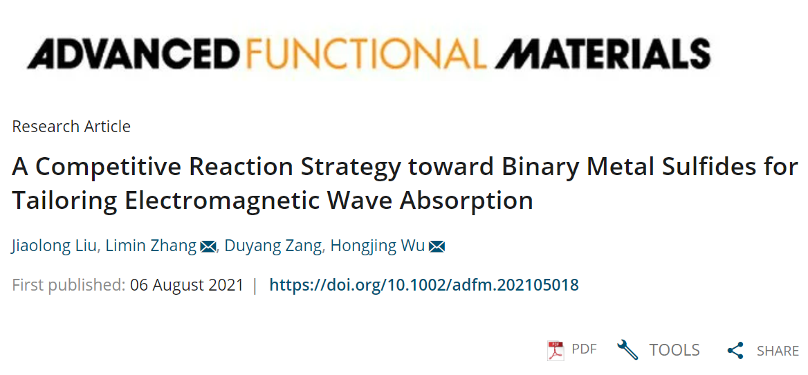 青年教师吴宏景副教授在电磁波吸收领域取得重要进展。相关研究成果以“A competitive reaction strategy toward binary metal sulfides for tailoring electromagnetic wave absorption”为题在线发表于国际知名期刊《Advanced Functional Materials》。论文第一作者为该院博士研究生刘骄龙,共同作者为该院臧渡洋教授,张利民副教授和吴宏景副教授为论文共同通讯作者。论文网址://doi.org/10.1002/adfm.202105018。