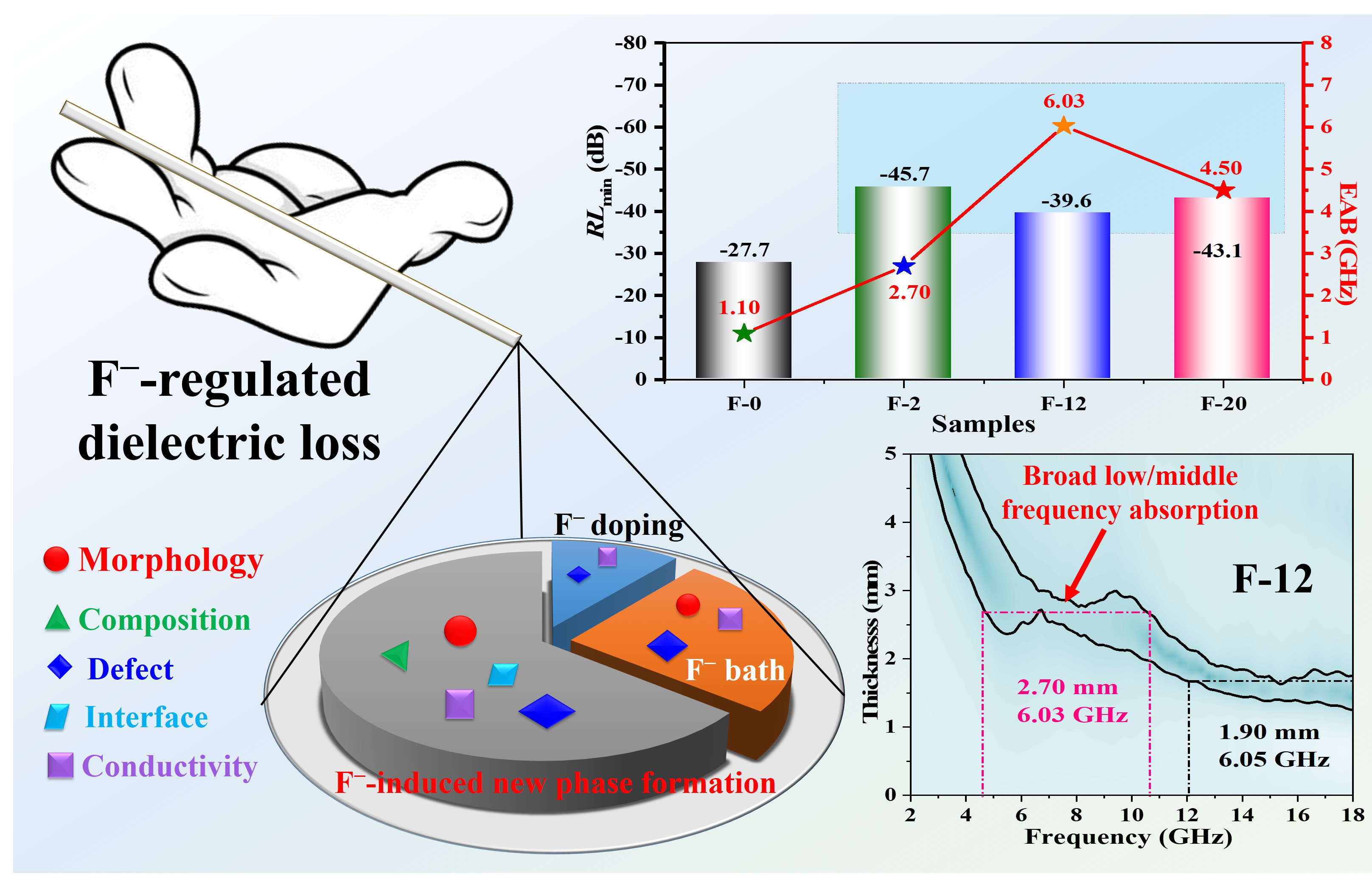 基于上述问题,受“氟老大(电负性最大的非金属元素)”的启示,研究团队创新性地提出了一种氟离子(F)调控策略。以二元钴镍(Ni-Co)金属硫化物为研究对象,研究人员发现,材料的形貌、组分、界面、缺陷和导电性这“五味中药”,可以通过氟离子这位医术精湛的“中医之手”来进行有效的调控(如1所示)。具体而言,研究人员通过灵活地调节氟离子的浓度大小和引入方式(原位引入或后氟化处理),可以使其能够以不同“角色”(即掺杂、形成新物相或氟离子浴)实现对上述“五味中药”的差异化“供给”,进而达到优化材料电磁参数和微波吸收性能的目的。这项工作不但系统阐述了氟离子在化学合成、微观结构设计和电磁波吸收中的独特作用,而且为目前5G通信技术中急需解决的低/中频电磁干扰问题提供了可行的思路。