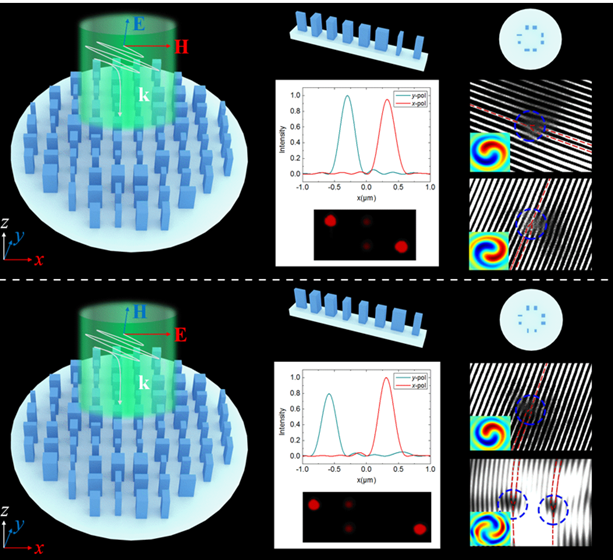 研究团队提出了一种基于重要纳米光子学材料——硅微结构的高效线极化复用介质光学超构表面,可以对不同极化的入射光进行独立的调控,极大的提升了对复杂光场操控的自由度。此外,按照一定的规律编码,实现了多通道极化复用的光束偏折和光涡旋。所提出的多功能硅超构表面为下一代集成光电子器件提供了一种设计思路。同时,单器件多通道独立工作的线极化复用为一种实用的提高了光场信息容量和安全性的方法,在光通信和信息加密等面向多路复用的应用中具有一定的潜力。