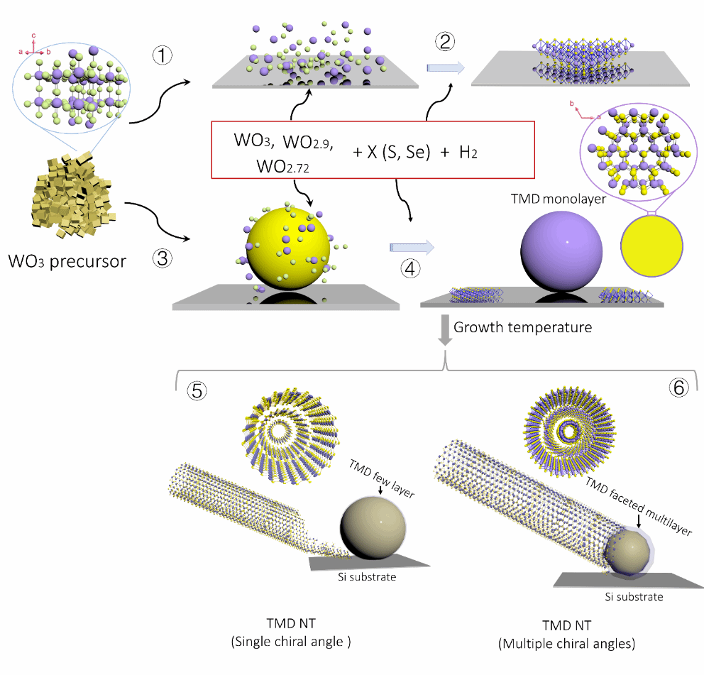 图1.以金纳米颗粒催化辅助的硫化钨纳米管生长示意图:步骤1-2:二维硫化钨结构在硅衬底外延生长;步骤3-4:金纳米颗粒的存在使硫化钨在其表面沉积并形成金颗粒-单层硫化钨壳层结构;不同的生长衬底温度决定两种不同的生长机制:5:界面生长模式对应单手性角纳米管的生长(~835–840 °C)和6:表面生长模式对应多手性角纳米管的生长(~840–845 °C)。