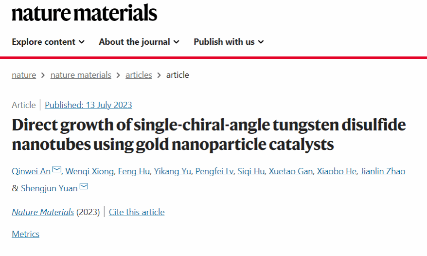 安钦伟课题组在《自然·材料(NatureMaterials)》杂志上在线发表题为“Direct growth of single-chiral-angle tungsten disulfide nanotubes using gold nanoparticle catalysts” 的研究论文。此项研究在国际上首次提出了一种基于金纳米颗粒催化的过渡金属硫族化合物纳米管生长新机制,实现了单手性角WS2和WSe2纳米管的一步生长,并成功揭示了纳米管手性特性与其结构驰豫、光学和电学性质的关系,为过渡金属硫族化合物纳米管的结构调控和物性研究提供了新的思路。